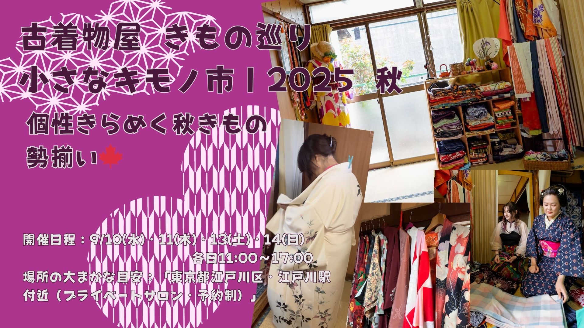 I will be hosting a small in-person Kimono Market at my private salon in Edogawa, where you can directly browse and enjoy the vintage kimono and accessories I’ve carefully selected.